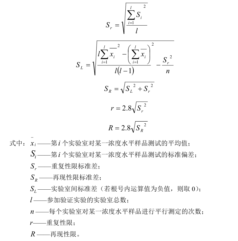 对某一水平浓度的样品进行l 个实验室的验证实验,每个实验室平行测定n 次,按如下公式进行重复性限r 和再现性限R 的计算: