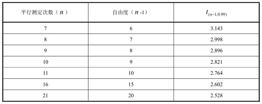 t(n−1,0.99):自由度为n−1(n为平行测定次数)、置信度 99% 的单侧 t 分布值(查表 A.1,如n=7时,t=3.143)
